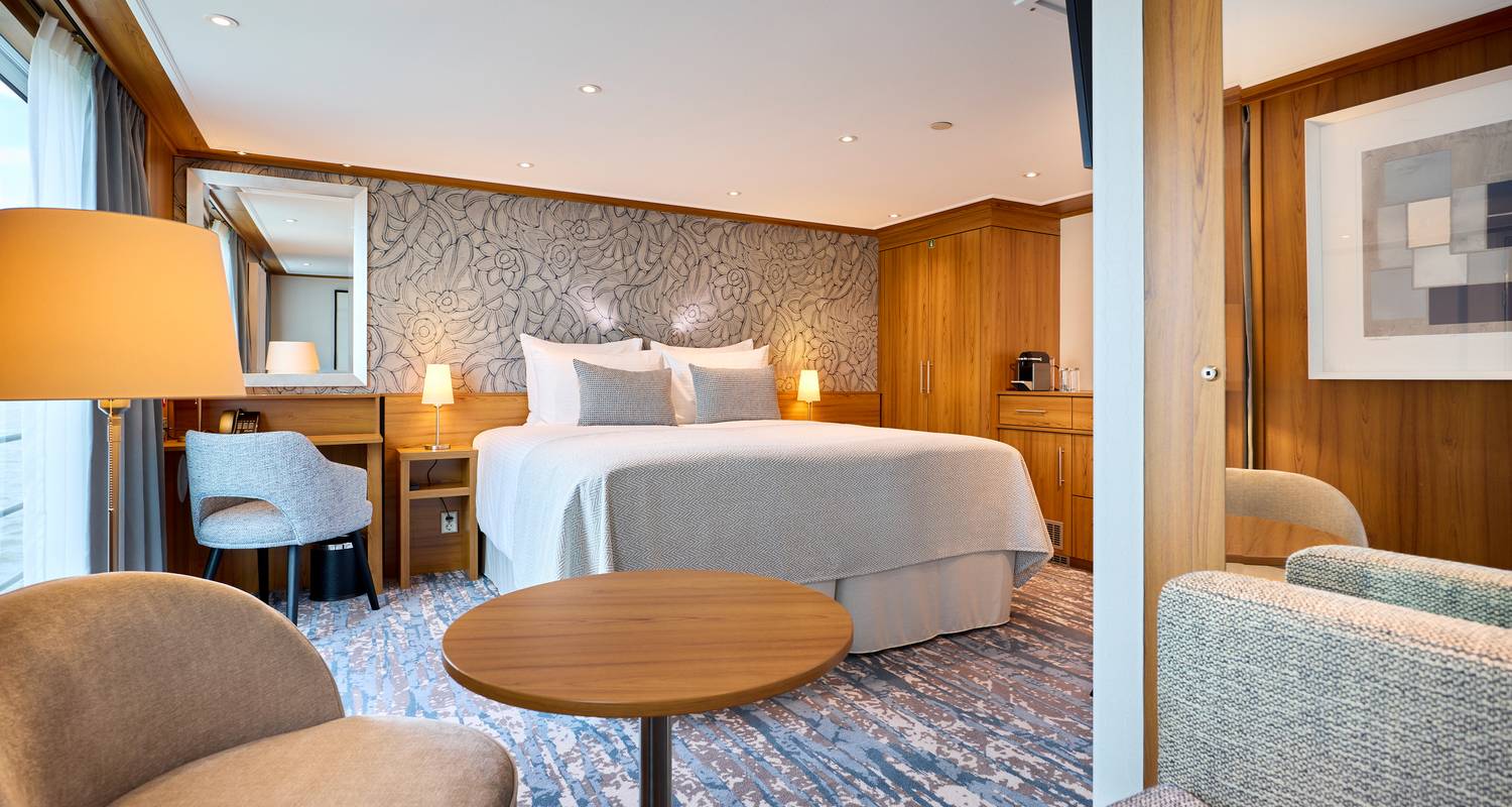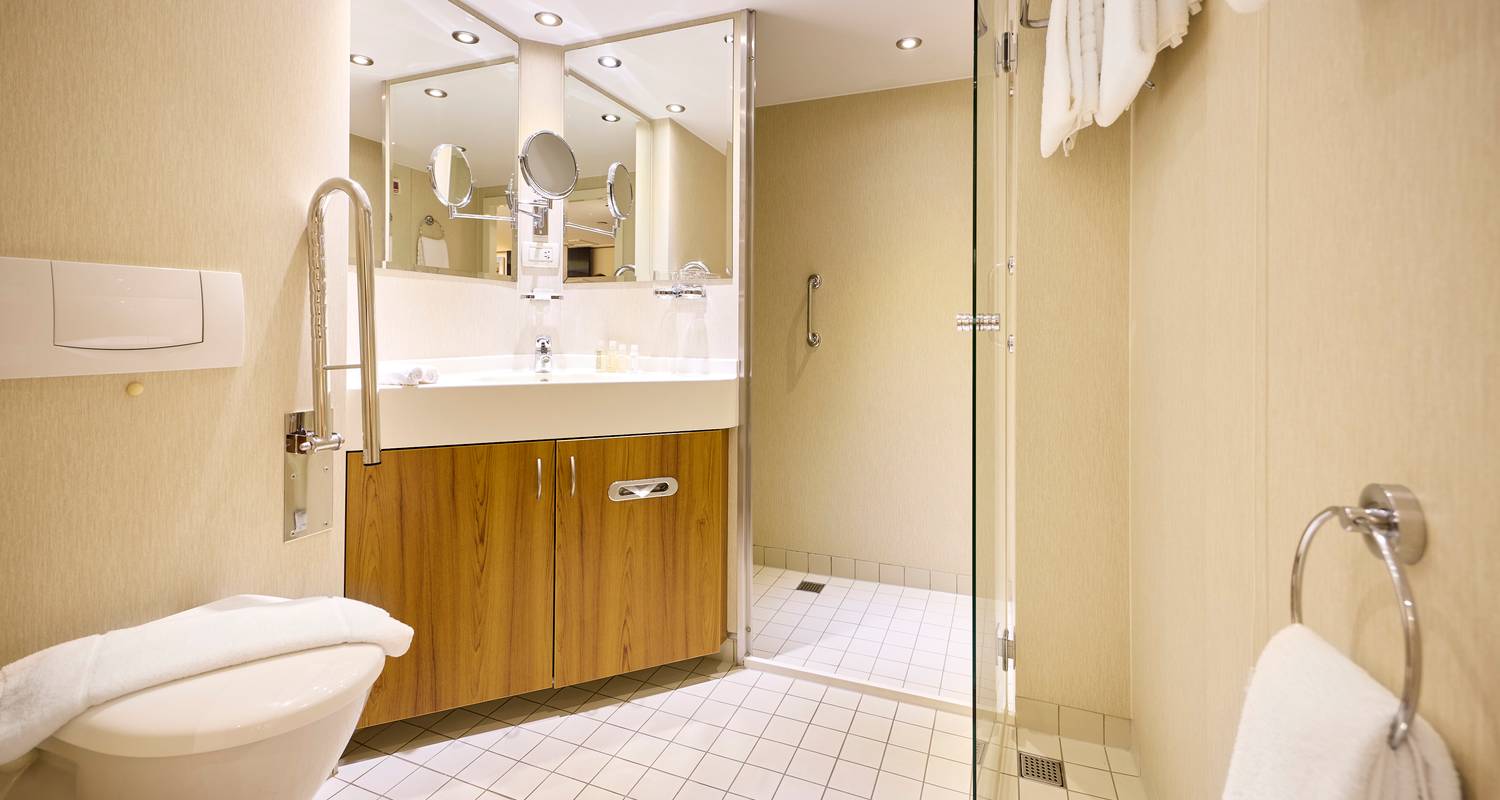 Accommodation: All cabins are exterior and have a shower and toilet, satellite TV, hairdryer, safe, internal telephone. Single cabins are compact (about 12m2) and have small windows (Emerald deck) or French balcony (Diamond deck). Standard double cabins have an area of about 15m2 and have small windows (Emerald deck) or French balcony (Ruby and Diamond decks). Deluxe cabins are spacious rooms of about 23m2 and have a French balcony. The only Suite on the ship is a comfortable room of about 30m2 with a French balcony and full bathroom.