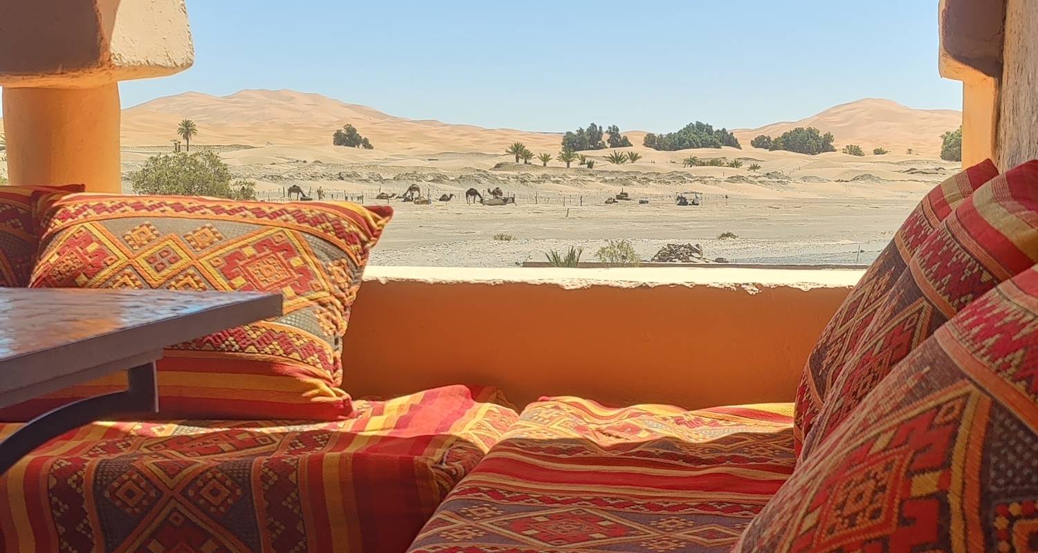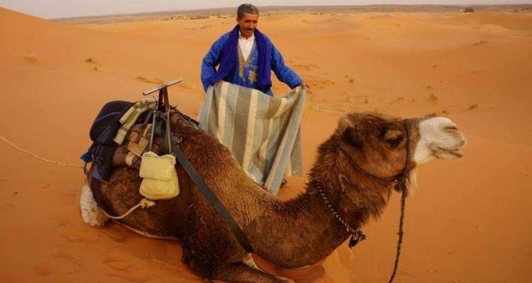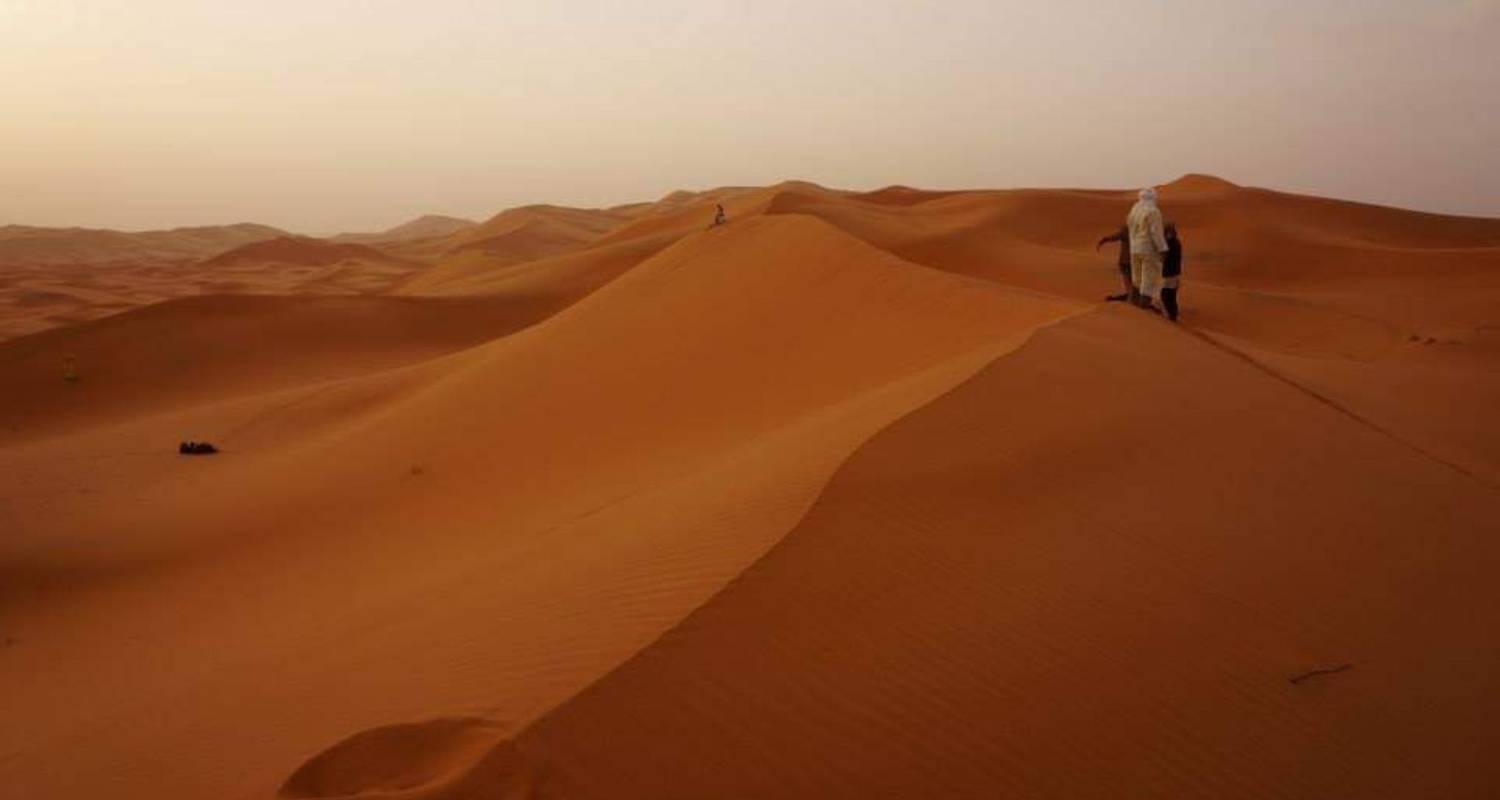 After breakfast, we'll drive from fes via Ifrane to Merzouga, with stops in Azrou forest and Midelt. Arrive in Merzouga for desert camp experience, including camel ride or 4x4 tour, sunset/sunrise views, campfire, music, and dinner. Overnight in private tent.